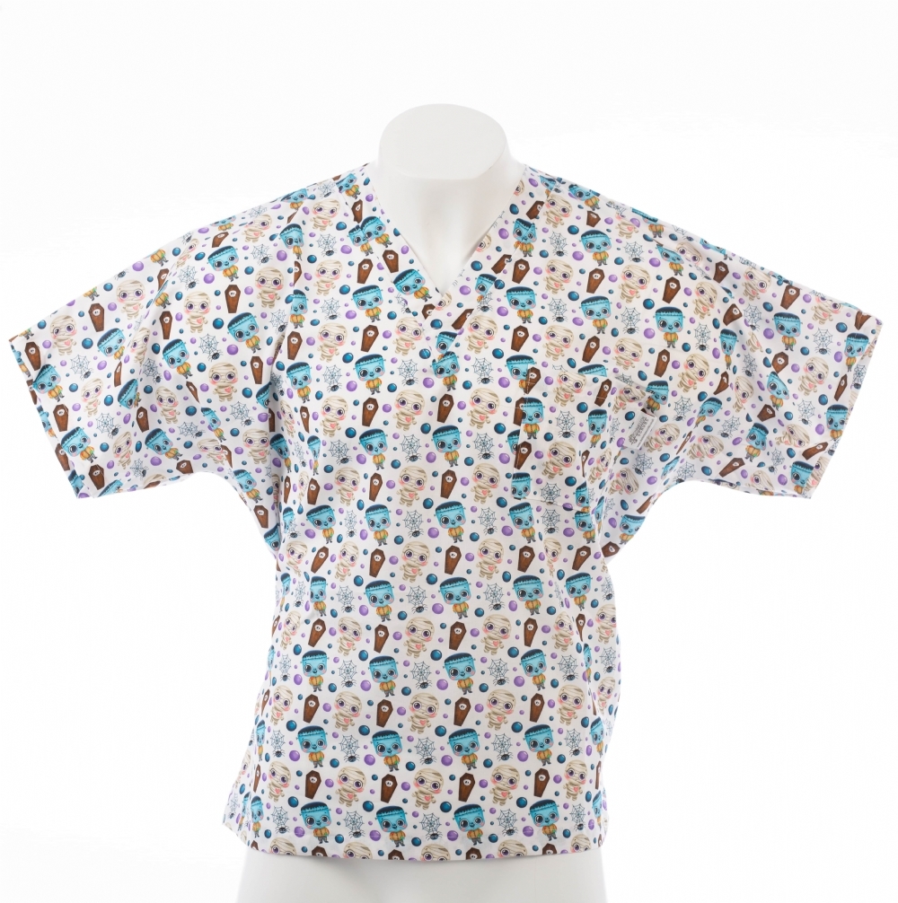 Buy SKU323PS - Halloween Spooks Short Sleeve Scrub Top 100% Cotton online from us for just £25.00 (£30.00 inc VAT), contact us for bulk and wholesale orders.