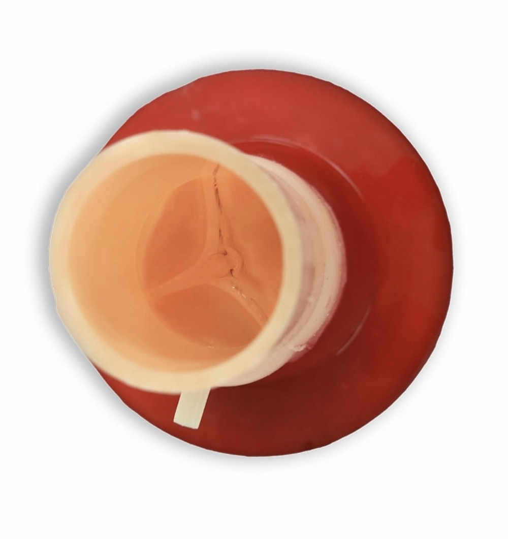 This training model replicates the structure of a bicuspid aortic valve, a condition where the valve has two leaflets instead of the normal three. Bicuspid aortic valves are one of the most common congenital heart valve abnormalities, affecting approximately 1–2% of the population.