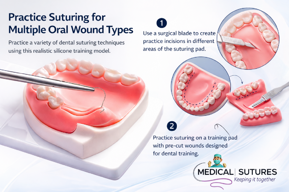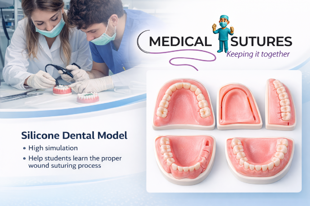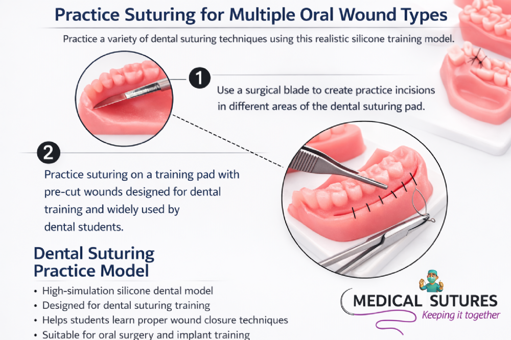 The model replicates the structure of the oral cavity, gums and teeth, allowing users to simulate a wide range of suturing techniques used in dental surgery, periodontal procedures and implant training. Silicone training models are commonly used in dental education because they provide a realistic environment for practising surgical skills before working on real patients.
