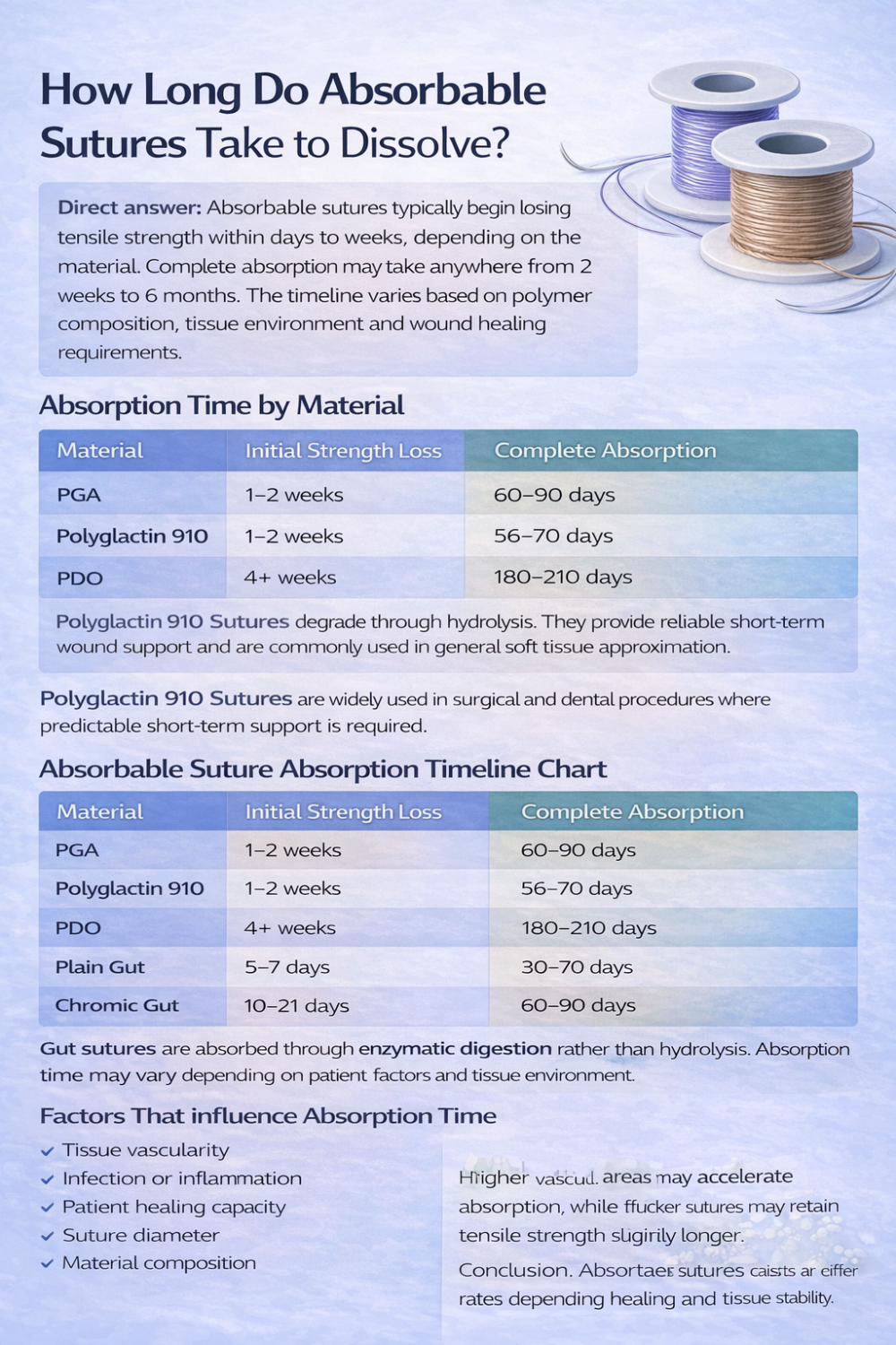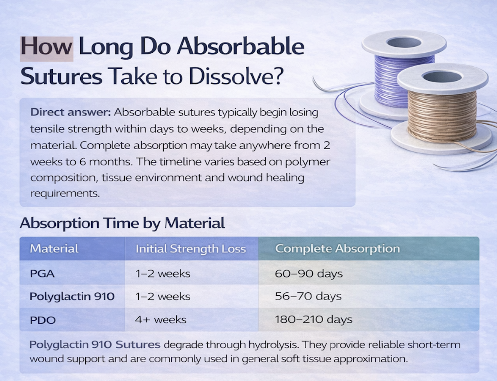 A clinical guide explaining how long absorbable sutures take to dissolve, with absorption timelines for PGA, polyglactin, PDO and gut materials to support informed surgical selection.