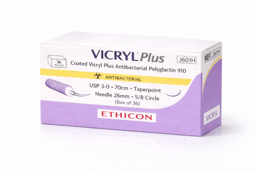Buy J601H - J601H Ethicon Coated Vicryl Plus Antibacterial Polyglactin 910 Braided Medical Sutures USP 3 0 – 70cm – 5 8 Circle Taperpoint Needle 26mm (Box of 36) online from us for just £167.07 (£200.48 inc VAT), contact us for bulk and wholesale orders.