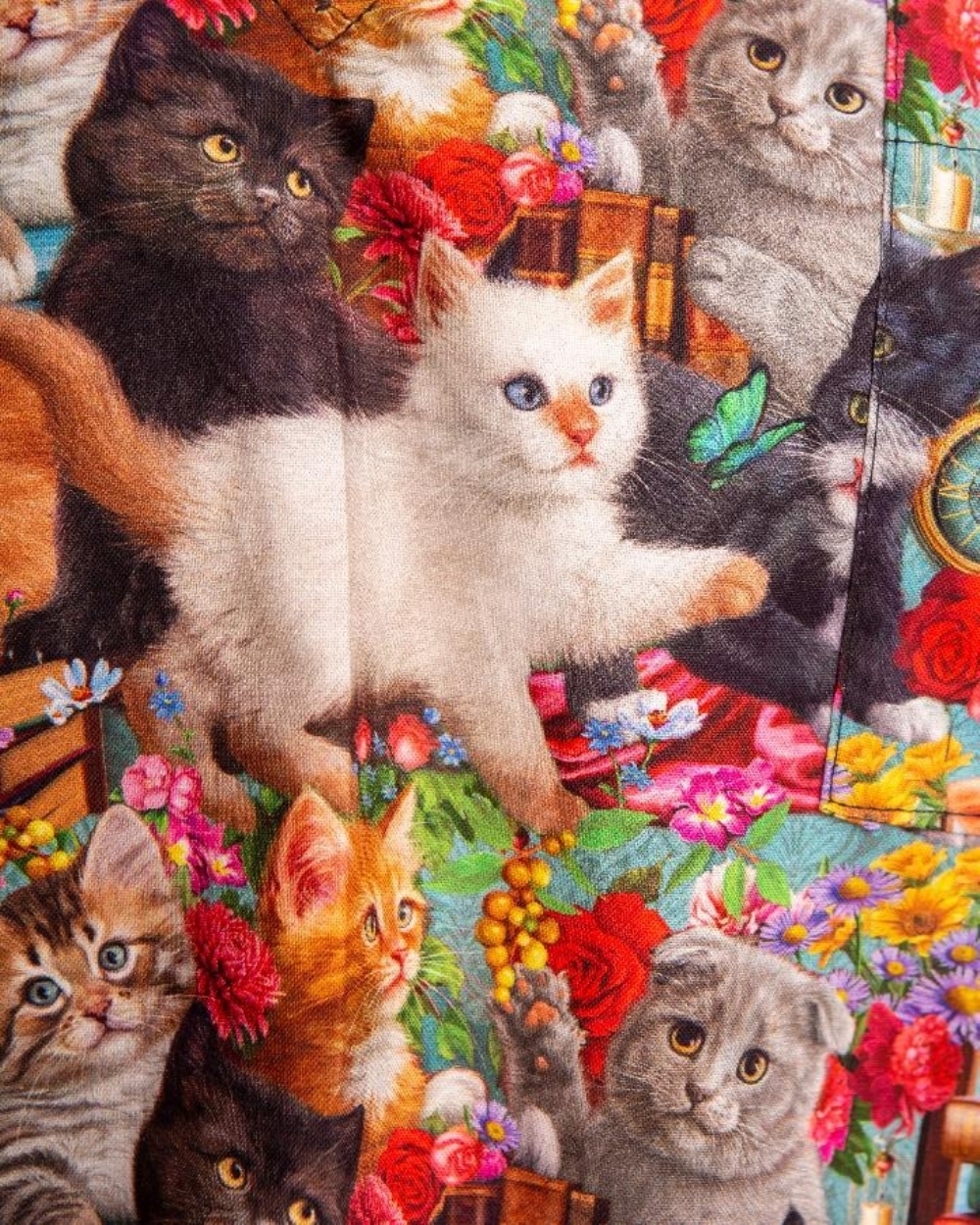 A practical chest pocket offers convenient storage for small essentials or technology, while the Kitty Cat print helps create a calm and welcoming atmosphere for patients, particularly in paediatric, dental and care environments.