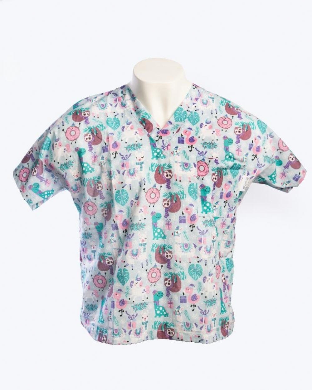 Little Johnny - Sloths Xmas Party Short Sleeve Healthcare Scrub Top 100% Cotton