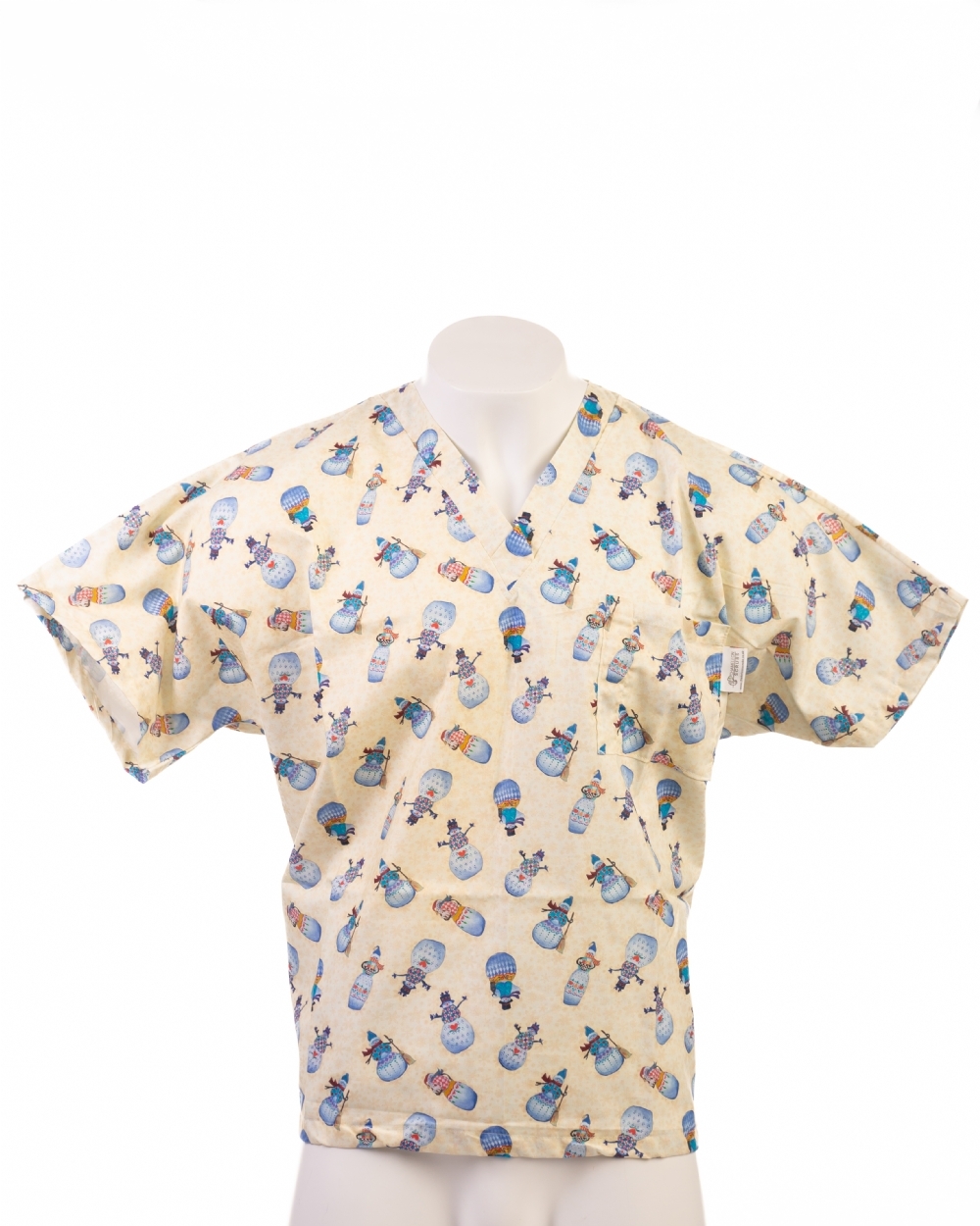 Festive Mr and Mrs Snowman scrub top made from 100% cotton, breathable, durable and professional. Comfortable unisex fit for NHS, clinics and patient-facing healthcare environments during Christmas season.