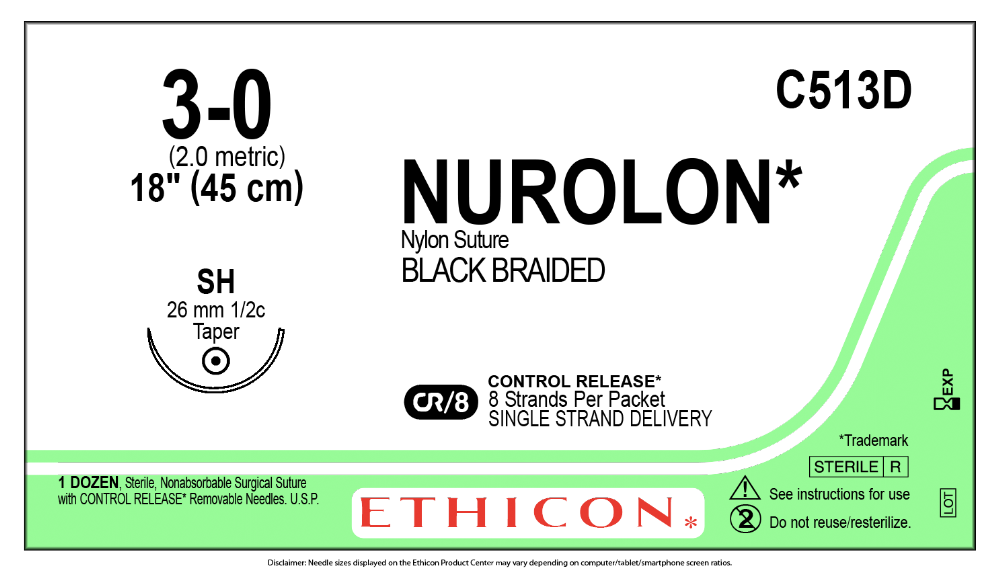 Buy C513D - NUROLON Nylon SutureSize: NUROLONColour: 3-0Style: non cutting online from us for just £238.28 (£285.94 inc VAT), contact us for bulk and wholesale orders.