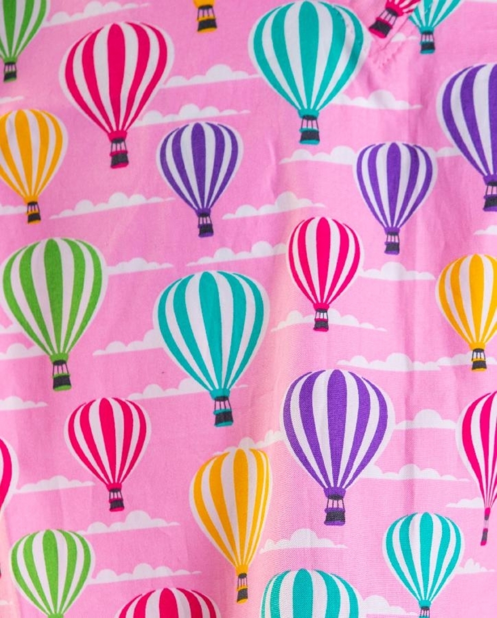 Pink hot air balloons patterned short sleeve medical scrub top made from 100% cotton, offering breathable comfort, durability and uplifting style for healthcare professionals working long shifts in clinical environments.