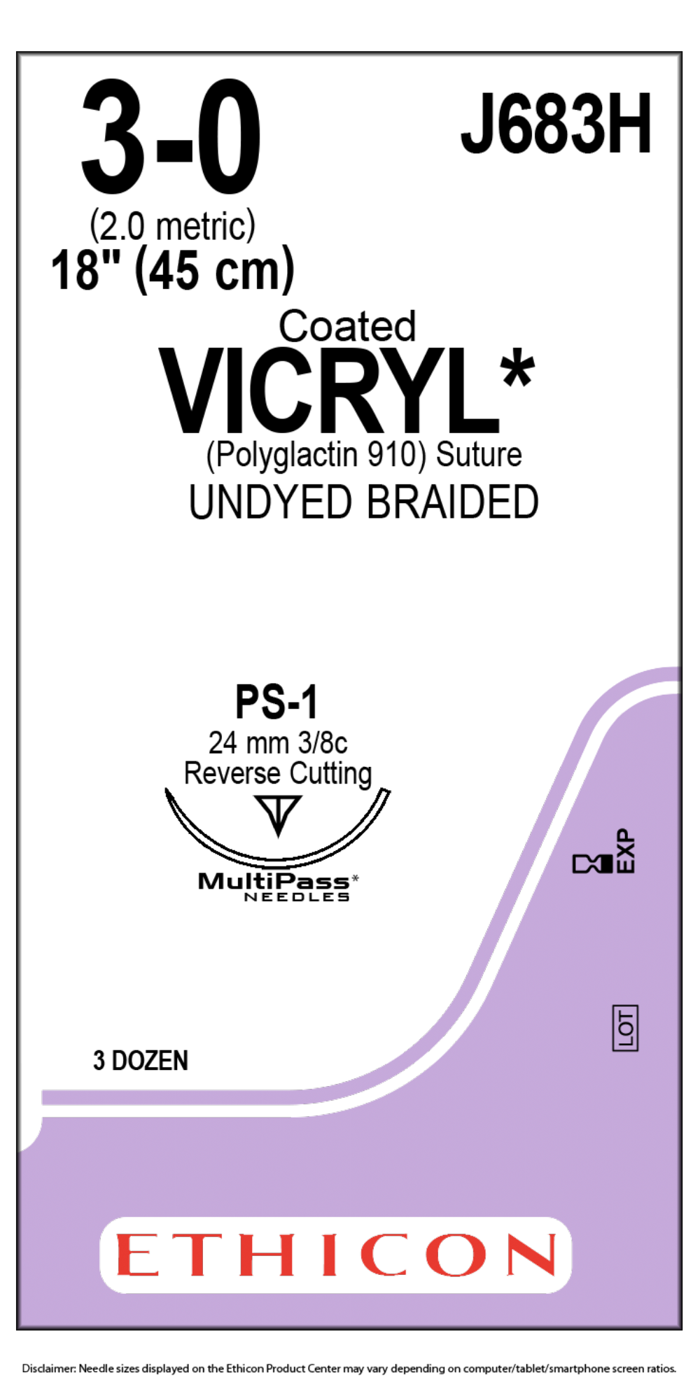 Buy J683H - COATED VICRYL (polyglactin 910) SutureSize: VICRYL PLUSColour: 3-0Style: cutting online from us for just £172.11 (£206.53 inc VAT), contact us for bulk and wholesale orders.