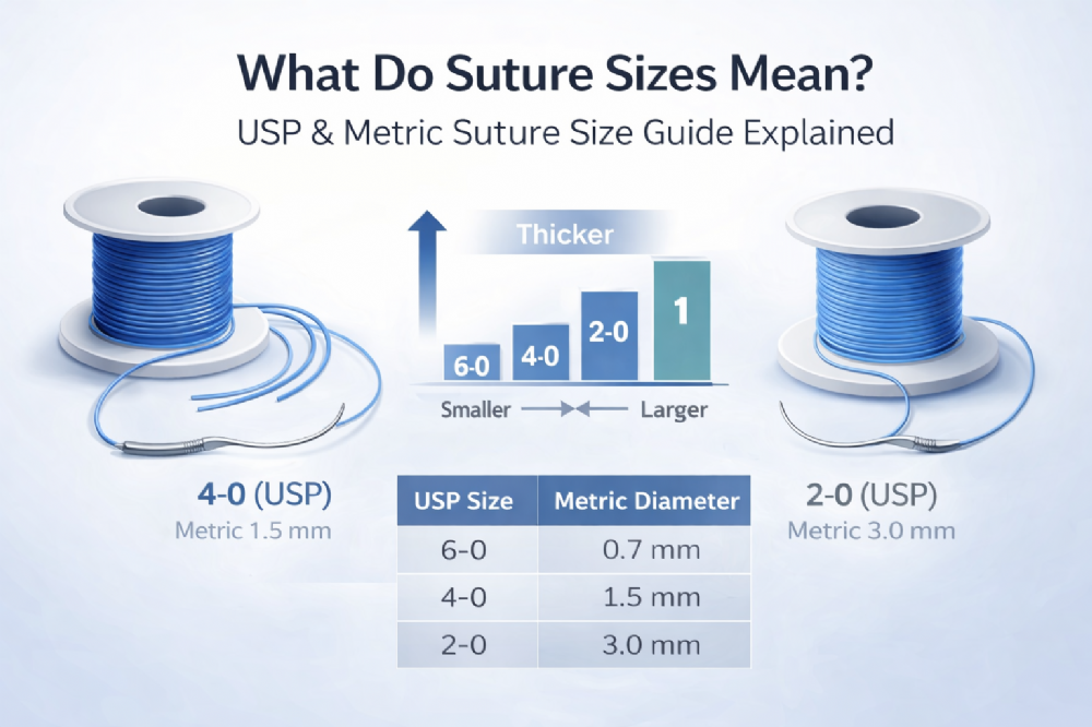 Quick answer: Suture sizes follow the USP (United States Pharmacopeia) system. The more zeros in the size (for example 6-0), the smaller the suture diameter. Larger numbers without zeros (for example 1 or 2) indicate thicker sutures. Metric sizing provides the diameter in tenths of a millimetre.