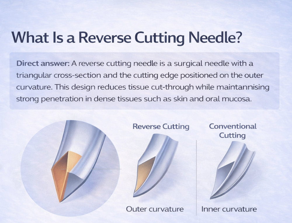 Direct answer: A reverse cutting needle is a surgical needle with a triangular cross-section and the cutting edge positioned on the outer curvature. This design reduces tissue cut-through while maintaining strong penetration in dense tissues such as skin and oral mucosa.