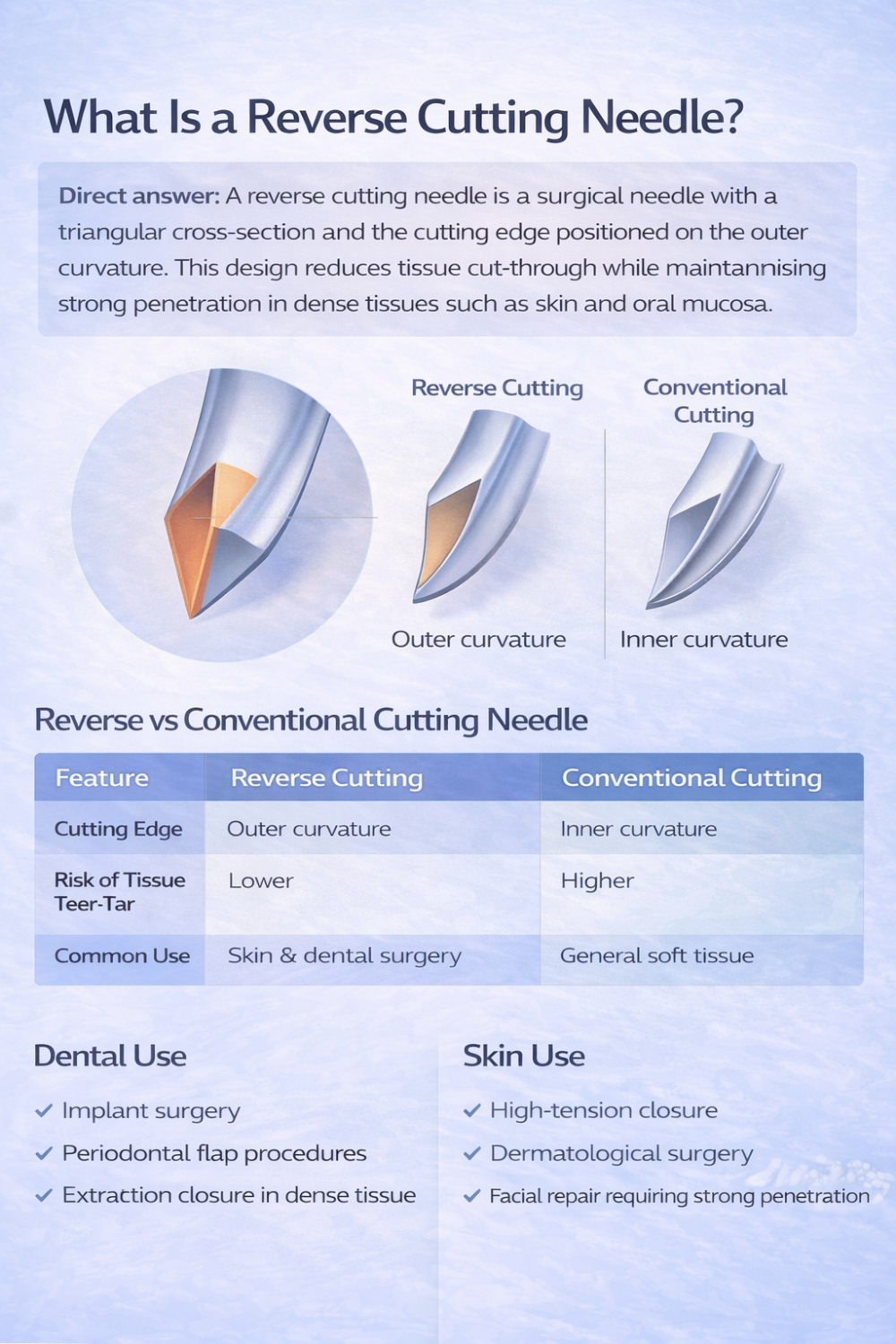 A clinical guide explaining reverse cutting needles, structural differences from conventional cutting needles and common dental and skin surgical applications.